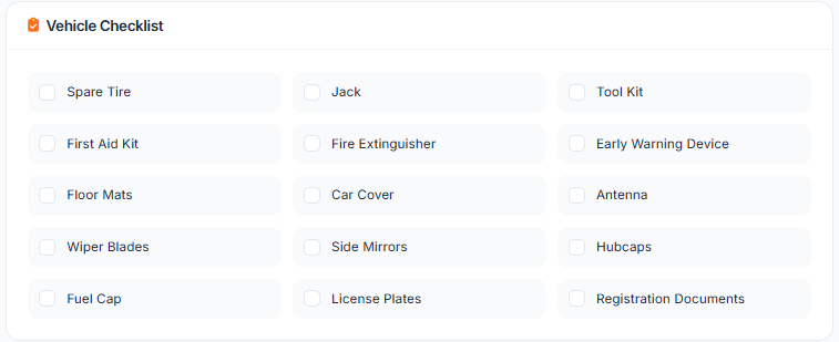 Check each item present in the vehicle. Missing items are automatically noted.